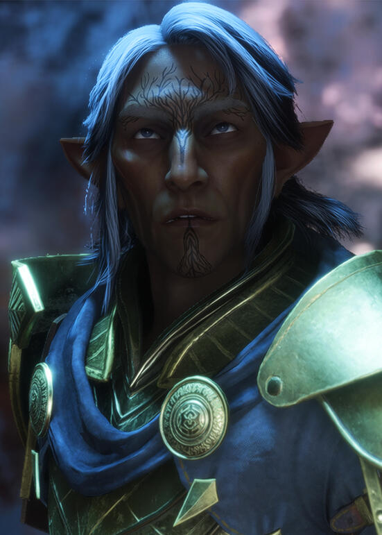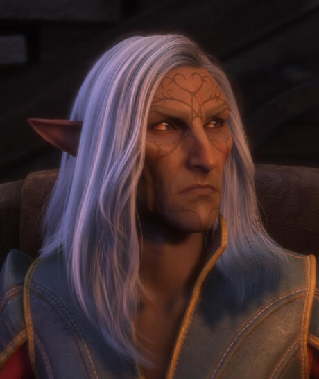 Complexion and skin tone: Bronze, aged/weathered. Has Mythal's vallaslin on his forehead, nose and chin.