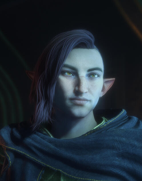 The oldest of four brothers born in the Kirkwall alienage, Runilaros spent much of his youth as other elven children might: dodging the notice of Templars and guards, helping support his family however he was able— not that he was able to help much, suffering from severe scoliosis, and long-lasting fatigue he would only discover the cause of well into adulthood. He would have lived happily the same way the rest of his life, if his magic hadn’t manifested just after his tenth birthday. His parents, knowing full well he wouldn’t survive long at the Gallows, vowed to protect their eldest son from the Chantry and their Circles, hiding him away while they were in the city and seeking help from their Dalish cousins, who helped Runilaros learn to control his magic. He would train in secret, in the family’s basement, to wield fire and ice— but, more importantly, how to use his magic to heal.When he came of age, Runilaros tried courting several young women of the alienage, both pure elves and simply elf-blooded— though it never felt right. So, rather than force himself into an unhappy relationship any longer, the young elf returned to his studies, and began serving the alienage as a healer. He watched his younger brothers grow, then have families of his own; he treated his nieces and nephews as his own children, teaching them whatever he could about the world beyond Kirkwall, how to tend to wounds, and how to read and write.His peaceful life was not to last, though: several weeks after his forty-fifth birthday while on an early morning walk, Runilaros found himself near the docks; he watched in horror as a load of cargo broke free from its ropes, nearly crushing a young dockworker to death. Without thinking, he froze the boxes and barrels in a pillar of ice— saving the young woman’s life, but revealing himself as an apostate, and (if the Chantry was to be believed) a danger to the entire town. He fled Kirkwall that same day, fearing both the Templar’s inevitable arrival to the Alienage, and what would become of him in the Gallows. The mage wandered the Wounded Coast for weeks before finally finding a suitable cavern to shelter in— a small, cozy cave not far from Kirkwall itself, well-hidden enough to escape the Constable's searches, but not too hidden for his family to eventually find him again.Runilaros realized he could never return to his old home, and vowed to remain there, in his little cave, to aid whoever he was albe— be it travelers along the roads and coasts, the Dalish who’d aided him when he was a boy, or city elves seeking magical skill, sound advice, healing, or a cup of tea. He sustains himself through a combination of healing magic, necromancy, and blood magic— partly out of a wish to aid others, partly out of spite for the Chantry, and finally, out of a fear of what waits for him after he passes on. For now, though, his door remains open to any who need help along the Wounded Coast.